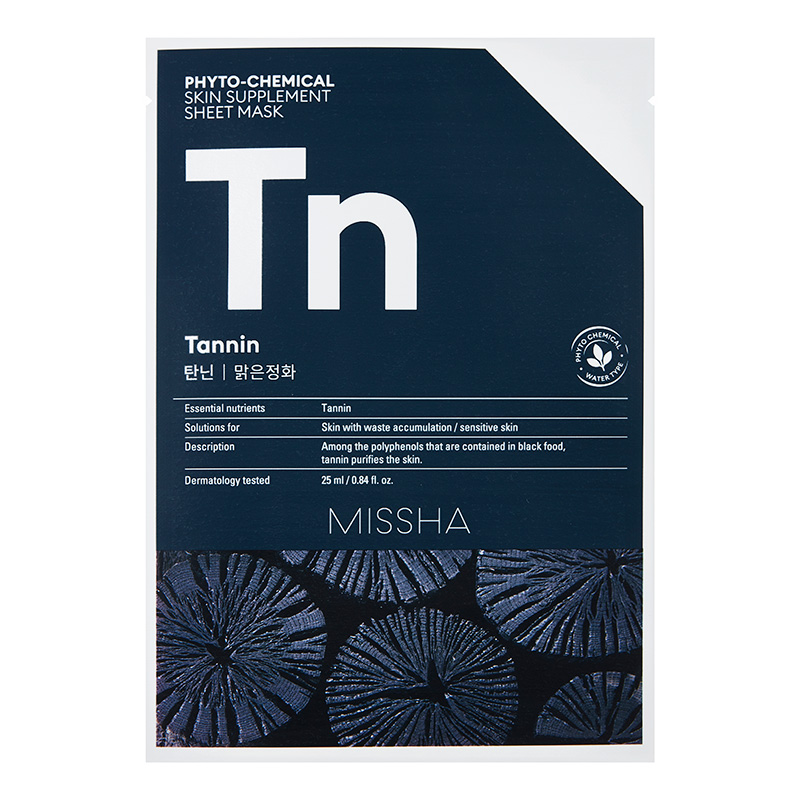 Phytochemical Skin Supplement Sheet Mask (Tannin) - Maseczka w ciemnej płachcie, kontroluje nadmiar sebum oraz oczyszcza skórę. Maska zawierająca w składzie taninę pozyskiwaną z ciemnych owoców oraz czarnej herbaty. Dodatkowo obecny jest węgiel, który oczyszcza skórę i reguluje wydzielanie łoju. Maska polecana cerze zanieczyszczonej, z zaskórnikami, ze zmianami trądzikowymi.