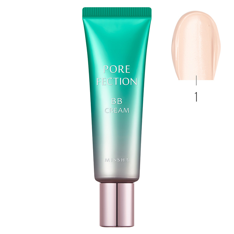 Pore-fection BB Cream SPF30/PA++ No1 - Rozjaśniający BB krem (kolor Light Beige). Ochronny krem na bazie witaminy B i ekstraktów roślinnych takich jak aloes czy papaja łagodzą podrażnienia oraz oczyszczają i wygładzają skórę. Krem w swoim składzie zawiera również niacynamidy, które kontrolują nadmierne wydzielanie się sebum, zmniejszają powstawanie zaskórników i działają przeciwzmarszczkowo. Dzięki właściwością ochronnym przed promieniami słonecznymi niweluje oznaki powstawania przebarwień. Krem ma lekką konsystencję i nie pozostawia tłustej warstwy. Skóra jest wygładzona, odświeżona i rozświetlona.