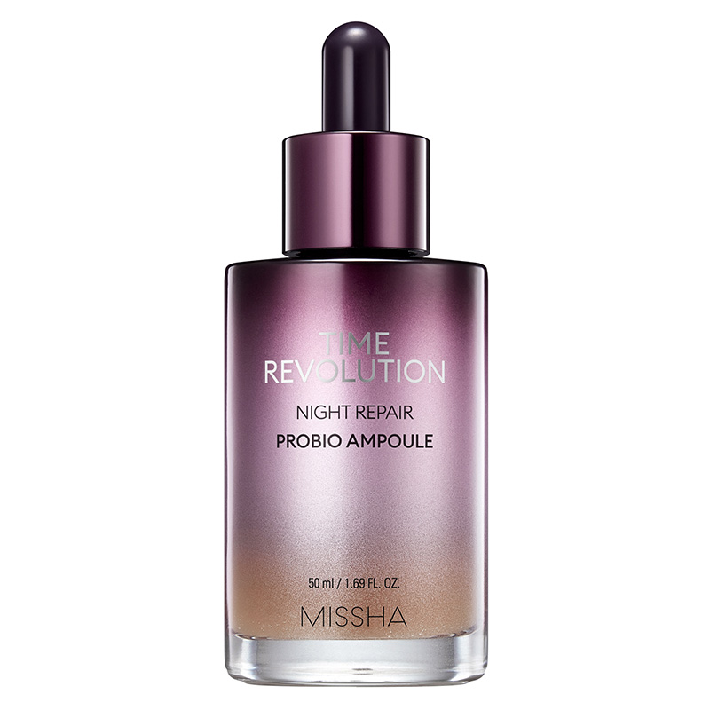 Time Revolution Night Repair Probio Ampoule - Intensywnie ujędrniające serum w ampułce czwartej generacji. Serum przeznaczone jest do cer matowych, które utraciły jędrność i witalność. Działa naprawczo oraz poprawia kondycję skóry. Wyrównuje jej strukturę oraz przyczynia się do redukcji zmarszczek. Serum opiera się bazie 50% sfermentowanego lizatu Bifida oraz ekstraktów roślinnych. W swoim składzie zawiera również 10 rodzai probiotyków, które regenerują skórę, dodając jej witalności i blasku. Kolejnym składnikiem jest kompleks 5 Violet Energy, czyli wyciąg z marchewki, kapusty modrej, bakłażanu, buraka i borówki, działając na skórę oczyszczająco oraz Collagener (ekstrakt z łubinu połączony z olejkami roślinnymi). Ostatni składnik wzmacnia naturalne funkcje ochronne. Serum szybko się wchłania, ma lekką żelową konsytencję w kolorze beżu.