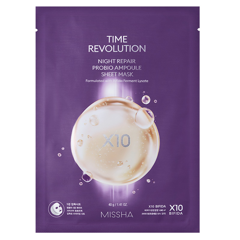 Time Revolution Night Repair Probio Ampoule Sheet Mask - Pięciowarstwowa maska w płachcie. Niezwykle wygodna w aplikacji maska w formie nasączonej esencją na bazie lizatu Bifida oraz ekstraktów roślinnych płachty. Idealnie sprawdzi się w pielęgnacji skór dojrzałych, matowych, które utraciły elastyczność i zdrowy koloryt. Maska zawiera aż 10 rodzajów probiotyków, które dzięki pozyskiwaniu metodą podwójnej fermentacji i przekształcaniu w fosfolipidy działają znacznie efektywniej i są szybciej absorbowane. Probiotyki rewitalizują skórę, wyrównują koloryt i przywracają młodzieńczy blask. Z kolei Kompleks 5 Violet Energy zawierający marchewkę, kapustę modrą, bakłażan, buraki oraz borówki dogłębnie oczyszcza skórę, nadając jej promienny wygląd. Collagener wpływa na wzmocnienie bariery ochronnej, a także poprawia teksturę naskórka. W efekcie po zastosowaniu maski skóra zyskuje odpowiedni poziom nawilżenia, gęstość, miękkość, gładkość i elastyczność.