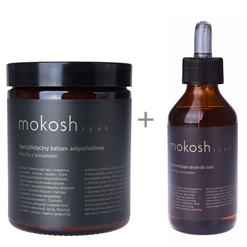 Brightening Body Serum Rozświetlające serum do ciała wanilia z tymiankiemMokosh Icon – Rozświetlające serum do ciała wanilia z tymiankiem jest produktem zapewniającym skórze nie tylko aksamitną gładkość i blask ale także wysoce skuteczną ochronę przed wolnymi rodnikami. W jego skład wchodzą organiczne oleje, skwalan i ekstrakty z roślin, które rewitalizują i mocno nawilżają skórę oraz dostarczają jej potrzebnych składników odżywczych. Zawarta w serum naturalna mika mineralna o perłowo-złotej barwie odbija światło i nadaje skórze blasku. Dodatkowo preparat wspomaga redukcję cellulitu dzięki olejowi z zielonej kawy i ekstraktowi z bergamotki. Kosmetyk wzbogacony jest również o ekstrakt z róży damasceńskiej, który łagodzi podrażnienia i spowalnia procesy starzenia.
