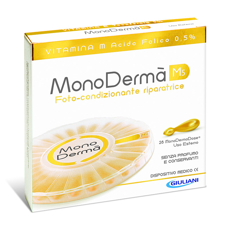MonoDerma M5 - Zawiera kwas foliowy w stężeniu 0,5%. Jedyny produkt na rynku zawierający kwas foliowy do stosowania miejscowego na skórę. Kapsułki przeznaczone do cery z widocznymi oznakami starzenia oraz jako prewencja przeciwstarzeniowa w młodym wieku. Skutecznie chronią przed powstawaniem zmarszczek oraz utratą kolagenu i elastyny. Przeciwdziałają fotostarzeniu się skóry. Idealnie sprawdzą się w przypadku skóry wrażliwej, ze skłonnością do podrażnień. Produkt intensywnie nawilża skórę oraz odbudowuje barierę naskórkową, chroniącą przed działaniem szkodliwych substancji. Dzięki właściwością łagodzącym, może być stosowany po zabiegach medycyny estetycznej.