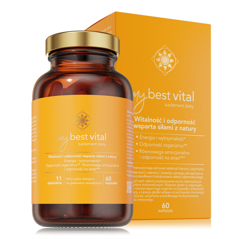 MyBestVital wyróżnia się kompleksowym składem, który łączy witaminy, minerały i adaptogeny, wspierając organizm na wielu poziomach. Preparat dostępny jest w wygodnej formie kapsułek.