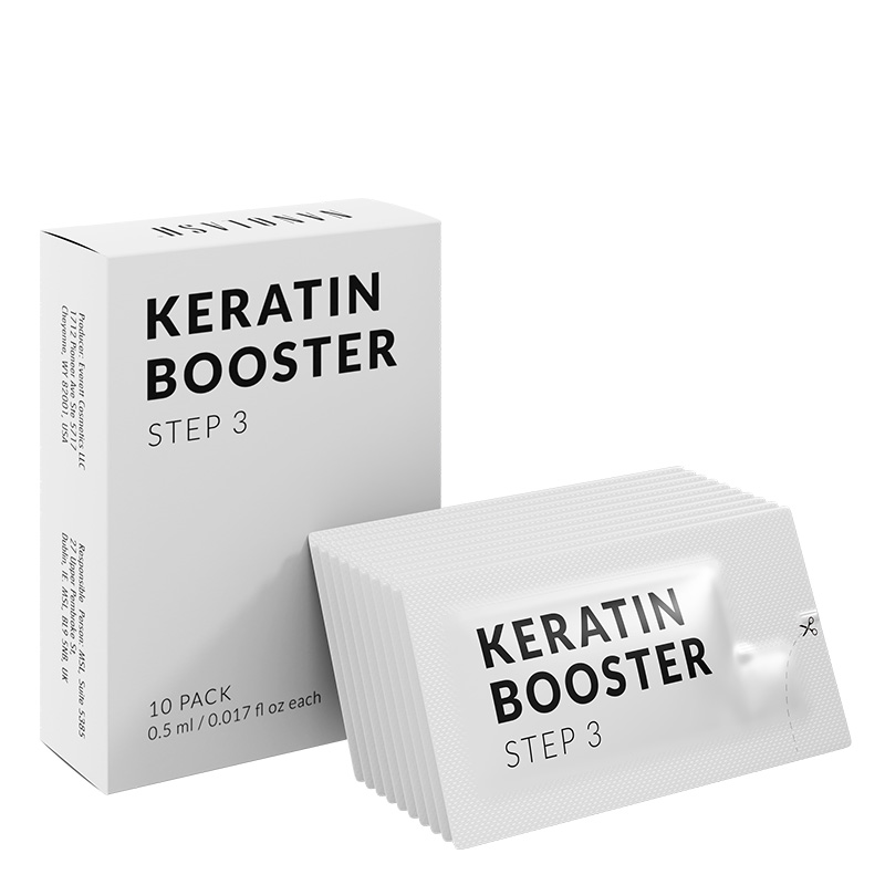 Step 3 Keratin Booster zawiera oliwę z oliwek oraz olej z awokado, które nawilżają rzęsy, nadają im blasku i sprężystości. Masło shea oraz olej abisyński wspierają regenerację podobnie jak hydrolizowana keratyna, a olej kokosowy domyka łuski oraz wygładza powierzchnię rzęs.