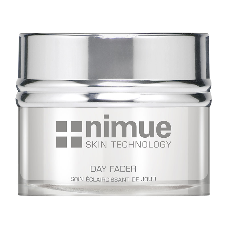 Day Fader - Krem rozjaśniający na dzień. Produkt należący do kroku 1 pielęgnacji Nimue, przeznaczony do cery hiperpigmentacyjnej, z widocznymi przebarwieniami łagodnymi oraz ostrymi. Posiada działanie rozjaśniające oraz wyrównujące koloryt cery. Produkt reguluję pigmentację, rozjaśnia skórę oraz ochrania ją przed szkodliwym działaniem wolnych rodników, które odpowiadają za przyspieszone starzenie się skóry. Podstawowym składnikiem preparatu jest kompleks rozjaśniający składający się z 5% wyciągu z mącznicy lekarskiej, który ma działanie hamujące tworzenie się pigmentu skóry. W kompleksie rozjaśniającym znajdziemy również 5% mieszankę roślinną, która posiada działanie łagodzące oraz kojące skórę. Ochronę antyoksydacyjną zapewnia witamina C - Ester C oraz witamina E - Ester E. Koloryt skóry po użyciu staje się wyrównany, przebarwienia rozjaśnione i mniej widoczne. Produkt zapobiega również tworzeniu się nowych przebarwień oraz spowalnia procesy starzeniowe. Skóra staje się optymalnie nawilżona, gładka i miękka w dotyku. Krem posiada pH 5,5.