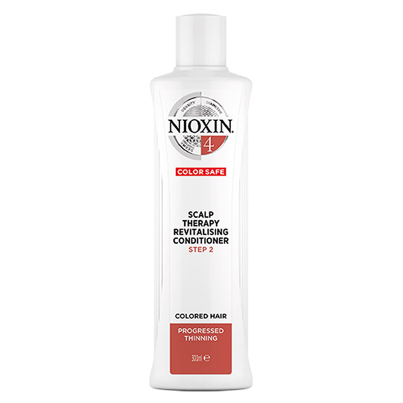 Scalp Revitaliser System 4 - Odżywka przeciw wypadaniu (włosy farbowane, cienkie, widocznie przerzedzone) 300 ml. Jeden z najskuteczniejszych preparatów służących niwelowaniu wypadania włosów i zwiększania ich objętości. Jak wynika z wielu badań klinicznych przynosi widoczne rezultaty w wyniku regularnego stosowania, zwłaszcza w połączeniu z pozostałymi produktami Nioxin System 4. Idealnie dopasowana odżywka nie tylko w przypadku postępującego łysienia, ale także służąca odbudowaniu struktury włosów po zabiegach farbowania i innych zabiegach chemicznych. Ochrona włosów cienkich i delikatnych. Kompleksy BioAMP i Glyco Shield głęboko oczyszczają i regenerują włosy. Kombinacja antyoksydantów, aminokwasów, wyciągi z herbaty i mięty zapewniają włosom odżywienie i nawilżenie.