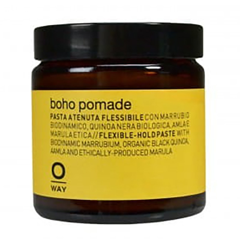 Boho Pomade - Pasta modelująca. Pomada, która zapewnia elastyczne utrzymanie fryzury. Poza funkcją stylizacyjną, wykazuje także działanie pielęgnacyjne. Jest wzbogacona o marrubium, który zwiększa naturalną odporność na działanie promieni UV. Innym cennym składnikiem jest komosa ryżowa działająca odżywczo i osłonnie na włókna włosów. Pozostałe składniki amla i marula - działają regeneracyjnie, nawilżająco oraz nadają naturalny, zdrowy połysk.