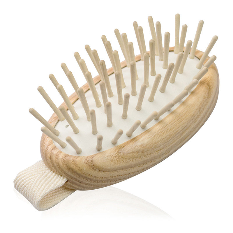 Circolo Szczotka do masażu skóry głowy. Drewniana szczotka do masażu skalpu wykonana przez włoskich rzemieślników zgodnie z wysokimi standardami jakości. Uchwyt i ząbki wykonane są z drewna jesionowego z certyfikatem FSC (lasy zarządzane w sposób zrównoważony), a pasek z naturalnej bawełny, podstawa ząbków wykonana z naturalnej (nie plastikowej) i hipoalergicznej gumy. Produkt został stworzony do przeprowadzenia łatwego i przyjemnego masażu skóry głowy, który przeprowadzany regularnie zapobiega wypadaniu włosów i wzmacnia skalp sprawiając, że włosy rosną zdrowsze i grubsze.