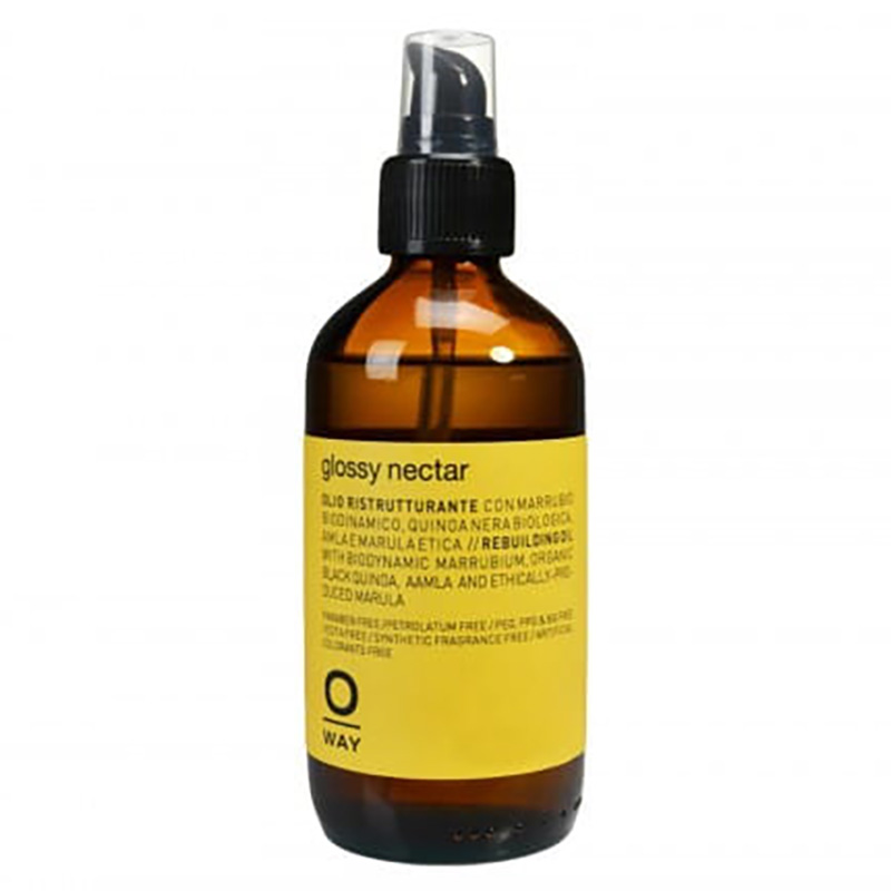 Glossy Nectar - Odbudowujący olejek. Preparat odbudowujący włosy dla wielbicieli form olejowych. Intensywnie odżywia nawet mocno zniszczone włosy. Działa ochronnie przed wyższymi temperaturami i szkodliwym działaniem innych czynników zewnętrznych. Używanie olejku sprawia, że włosy stają się jedwabiście miękkie w dotyku, lśniące i gładkie. Z bardzo dobrym rezultatem odbudowuje uszkodzenia, które już powstały i zabezpiecza przed powstaniem kolejnych.