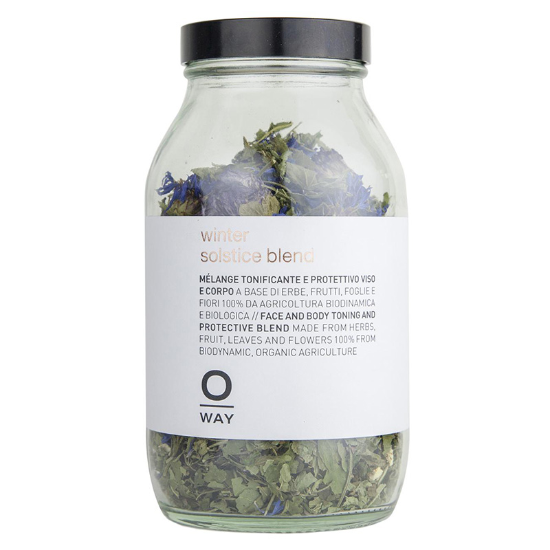 Winter Solstice Blend Mieszanka - ochronno ujędrniająca do skóry twarzy i ciała. Mieszanka została stworzona z wyselekcjonowanych ziół, liści, kwiatów i ziół, które pochodzą z organicznego i biodynamicznego rolnictwa. Rośliny, które rosną zimą i jesienią wyróżniają się bogactwem witamin, które regenerują komórki skóry, ujędrniają, stymulują syntezę kolagenu, dodając skórze sprężystości i elastyczności. Dodatkowo rośliny bogate są w flawonoidy, których zadaniem jest silne wzmacnianie i ochronę skóry przed czynnikami zewnętrznymi. Mieszanka jest również źródłem antocyjanów, które są antyoksydantami, działając ochronnie i przeciwzapalnie. Mieszanka Winter Solstice blend ma w składzie melisę lekarską, rozmaryn, tymianek, chaber, malwę, skórkę pomarańczową i miętę pieprzową.