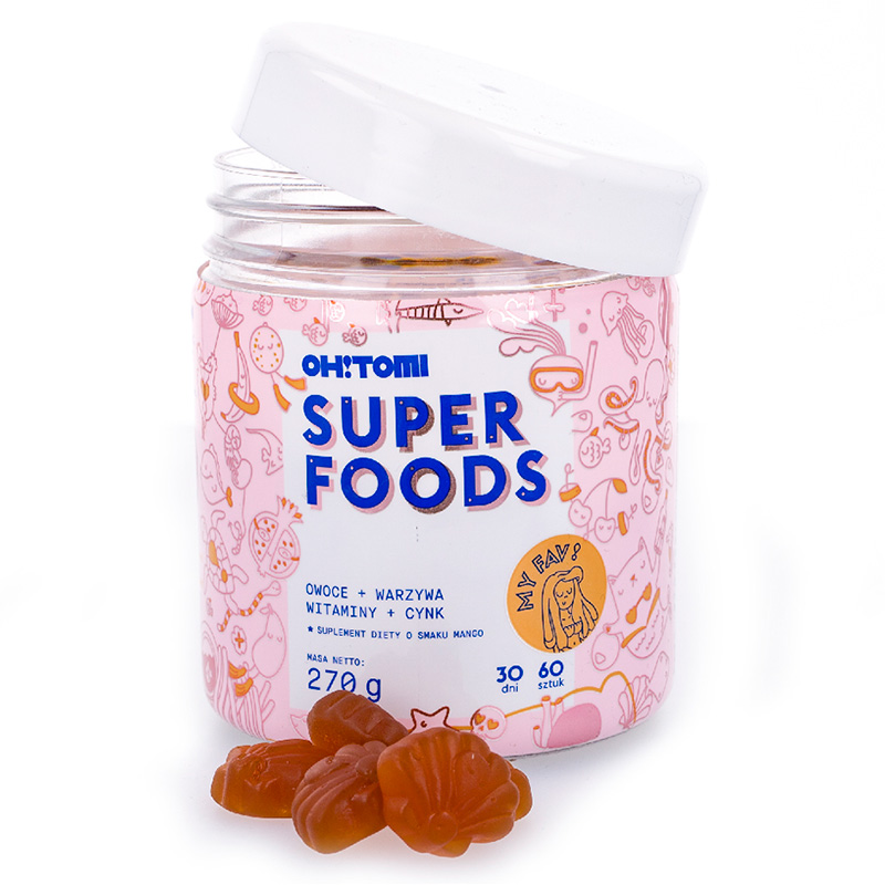 Super Foods - Witaminy. Żelki w kształcie małych muszelek są suplementem przeznaczonym dla dorosłych oraz dzieci już od 7 roku życia! W każdej porcji znajduje się aż 11 witamin, w tym witaminy A, C, E, D, witaminy z grupy B, a także cynk oraz owoce i warzywa określane mianem Superfoods. Uroda, młodość i siła od wewnątrz! Przyjemna słodycz mango połączona jednocześnie lekko kwaśnym smakiem dodaje energii każdego poranka.