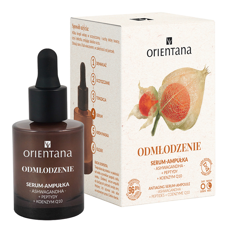 Ashwagandha to znany adaptogen, który wykazuje szereg korzystnych właściwości. Zastosowany na skórę wspomaga jej regenerację oraz wykazuje właściwości antyoksydacyjne. Przywraca skórze blask i sprawia, że staje się elastyczna. Koenzym Q10, również wykazuje silne właściwości przeciwutleniające, dzięki czemu serum chroni skórę przed stresem oksydacyjnym i zabezpiecza przed fotostarzeniem. Peptydy stymulują produkcję kolagenu, wpływając na poprawę jędrności i elastyczności skóry.