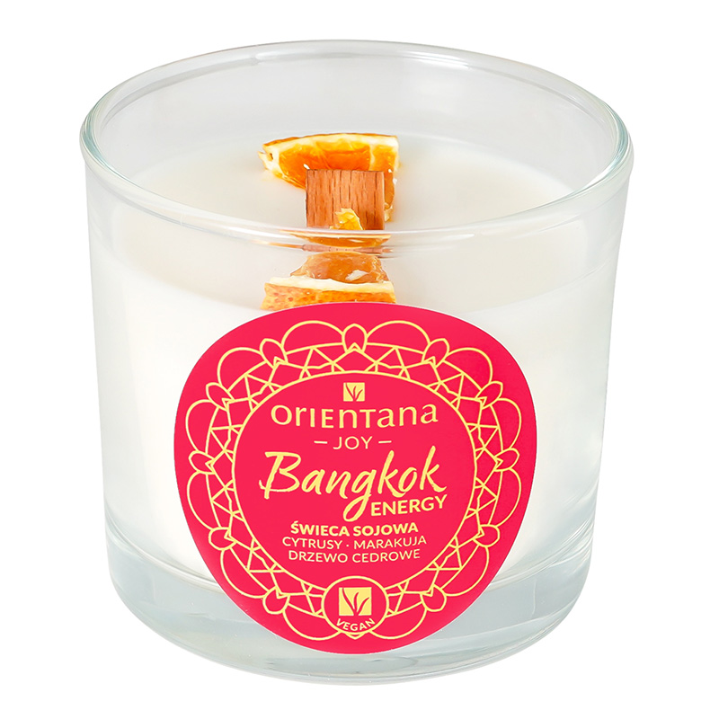 Ręcznie odlewana świeca z wosku sojowego z drewnianym knotem i ozdobną posypką z suszonych, naturalnych składników. Kompozycja aromatyczna wyczuwalna w świecy powstała we współpracy z francuskimi senselierami, po to, by jak najlepiej oddać klimat egzotycznej Tajlandii i tętniącego życiem Bankoku.