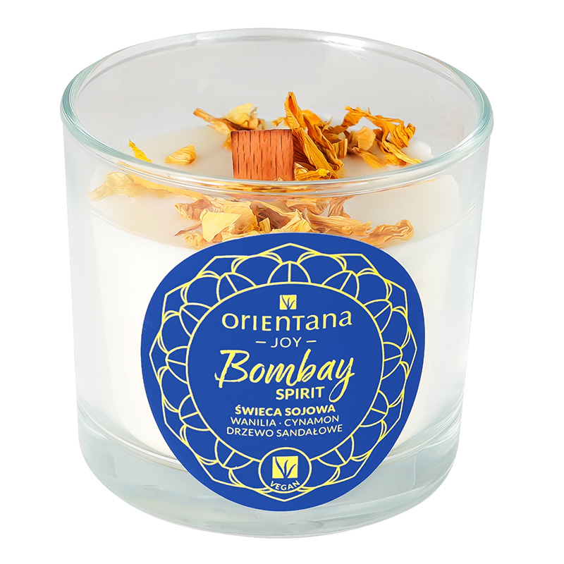 Ręcznie odlewana świeca sojowa z naturalnym drewnianym knotem i ozdobną posypką z suszonych, naturalnych składników. Kompozycja aromatyczna wyczuwalna w świecy powstała we współpracy z francuskimi senselierami, po to, by jak najlepiej oddać nastrój egzotycznego, orientalnego i tajemniczego Bombayu.