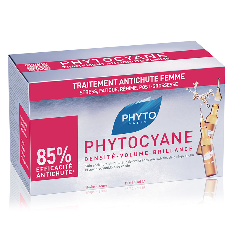 Phytocyane - Rewitalizujące ampułki przeciw wypadaniu włosów dla kobiet. Preparat rekomendowany dla kobiet borykajacych się z problemem nadmiernego wypadania włosów czy słabej witalności włosów. Preparat łączy w swobie działania mające zapobiec nadmiernej utracie włosów, pobudzić porost włosów oraz poprawić ogólną kondycje włosów. Kuracja opiera swoje działanie na połączeniu aminokwasów siarkowych, wyciągu z miłorzębu japońskiego oraz kory kaliny, dzięki czemu działa kilkutorowo. Procyjanidy otrzymane z winogron wykazują silne działanie antyoksydacyjne oraz zapobiegające starzeniu włosów. Witaminy z grupy B wraz z proteinami jedwabiu przywracają włosom gęstość i połysk. Włosy stają się sprężyste, zrewitalizowane i gęste.
