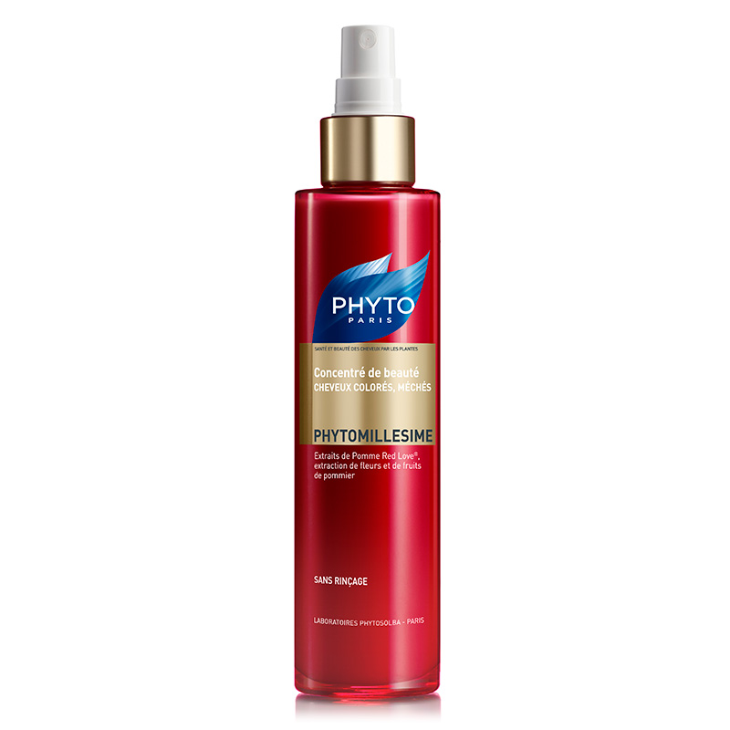 Phytomillesime Concentre - Koncentrat piękna. Produkt rekomendowany dla dla włosów farbowanych. Zawiera w swoim składzie wyciąg z jabłka Red Love®, który jest bardzo silnie działającym antyoksydantem oraz chroni włosy przed negatywnym wpływem czynników zewnętrznych. Ponadto zawarte w koncentracie ekstrakty z owoców i kwiatów jabłoni wraz z ekstraktem z hibiskusa wygładzają łuski włosów, dzięki czemu zapobiegają splątaniu. Koncentrat doskonale ożywia kolor włosów oraz chroni je przed czynnikami fizykalnymi takimi jak ciepło czy promieniowanie UV. Stosowany przed stylizacją zapobiega puszeniu włosów. Sprawia, iż włosy zyskują piękny, jedwabisty wygląd.