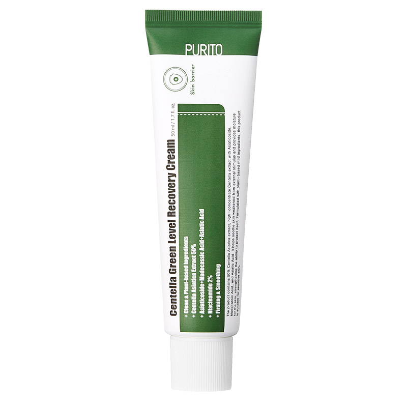 Purito Centella Green Level Recovery Cream to idealna propozycja dla każdej skóry, która potrzebuje regeneracji, odbudowy i działania łagodzącego. Dzięki wyciągowi z wąkroty azjatyckiej wykazuje silne działanie przeciwzapalne, kojące oraz naprawcze. Redukuje wszelkie stany zapalne na skórze - zarówno te w przebiegu trądziku pospolitego, jak również wywołane zbyt agresywną pielęgnacją czy trudnymi warunkami zewnętrznymi. Odpowiedni jest dla każdego rodzaju skóry. Posiada formę lekkiego kremu, który dobrze się wchłania, ale jednocześnie pozostawia na skórze przyjemną, otulającą warstwę, która przywraca skórze komfort. Do tego przepięknie pachnie lawendą! Idealny kosmetyk nie tylko w przypadku konieczności regeneracji skóry, ale także do codziennej pielęgnacji - szczególnie przy stosowaniu retinolu czy kwasów.