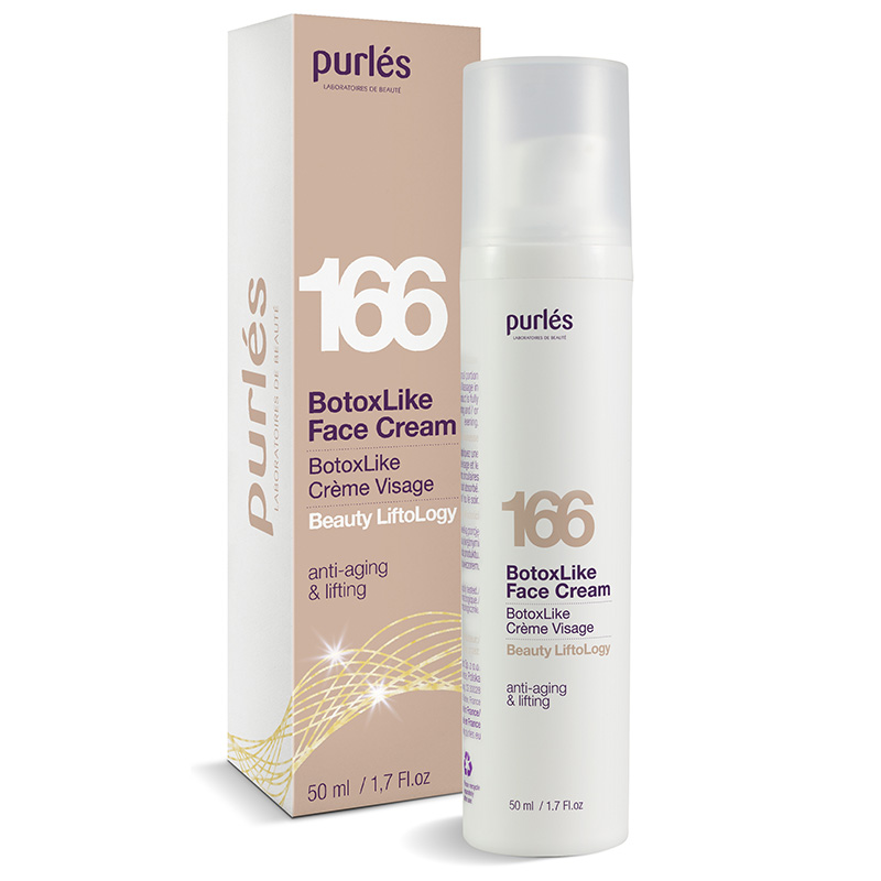 Purles 166 BotoxLike Face Cream zawiera stoechiol, który jest substancją z grupy botox-like. Przeciwdziała powstawaniu i utrwalaniu się zmarszczek mimicznych. W recepturze połączono algi i niskocząsteczkowy kwas hialuronowy, dzięki czemu krem gwarantuje długotrwałe nawilżenie, a w długofalowej pielęgnacji także efekt wypełnienia skóry.