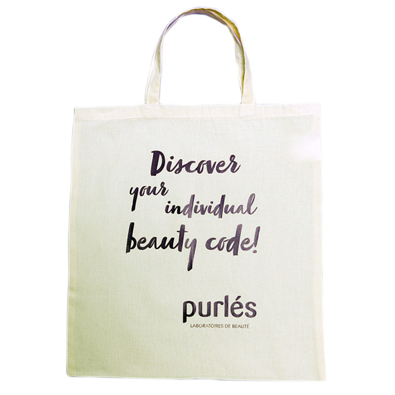 Estetycznie wykonana, materiałowa torba w jasnym kolorze z nadrukiem marki Purles.