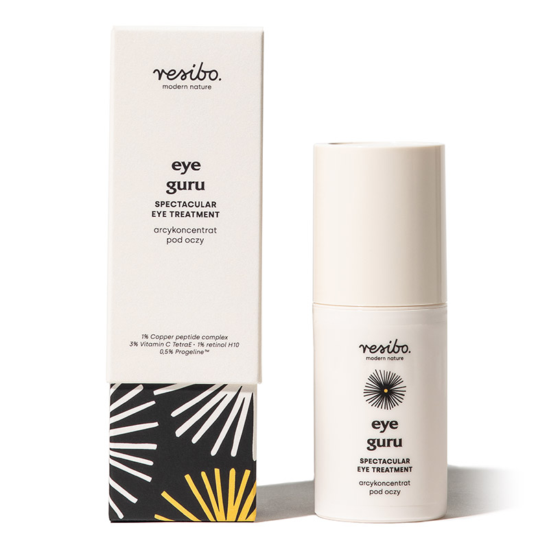 Resibo Eye Guru posiada skoncentrowaną i bogatą w składniki aktywne formułę. Swoje przeciwstarzeniowe działanie opiera na peptydzie miedziowym (1%), peptydzie biomimetycznym (0,5%), witaminie C (3%) w najbardziej stabilnej postaci tetraizopalmitynianu askorbylu oraz retinolu H10 (1%).
