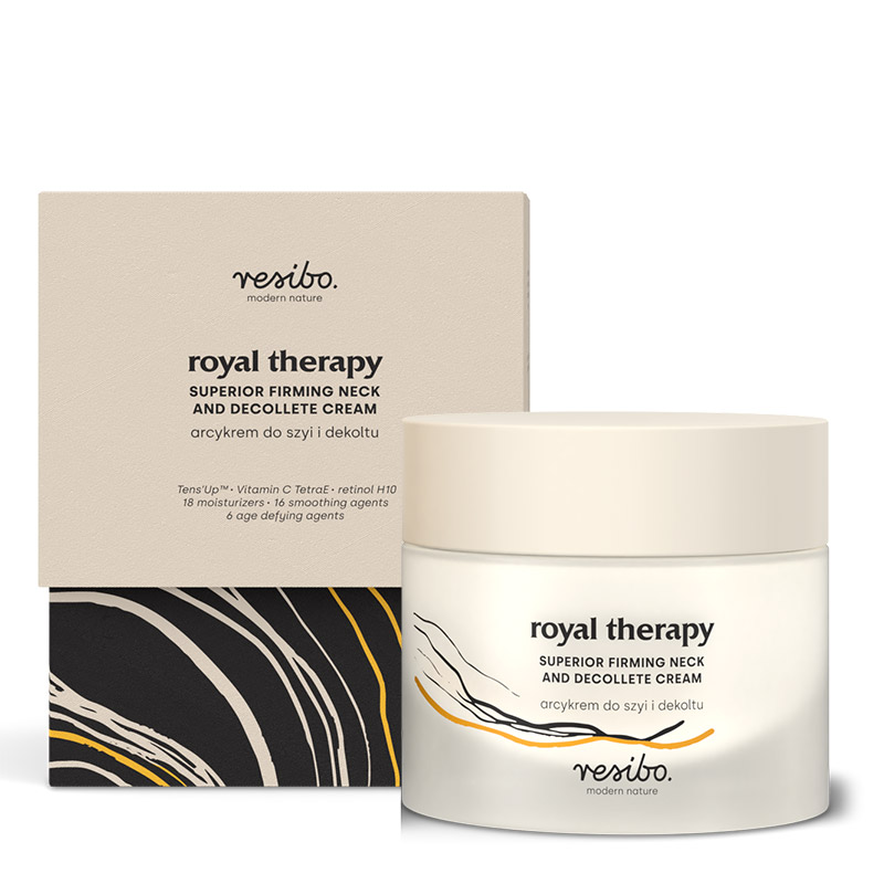 W efekcie systematyczneego stosowania Resibo Royal Therapy skóra szyi i dekoltu zyskuje lepszą kondycję i napięcie, a drobne linie i zmarszczki ulegają spłyceniu.