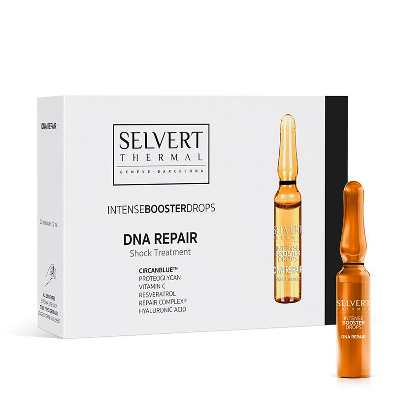 Głównym składnikim ampułek Intense Booster Drops DNA Repair jest Circanblue™, który neutralizuje negatywne skutki, wywołane przez światło niebieskie (HEV), takie jak: negatywny wpływ na witalność komórek skóry, syntezę ATP oraz wzrost produkcji wolnych rodników i uszkodzeń DNA. Dodatkowo w składzie koncentratu znajduje się działający antyoksydacyjnie resweratrol i witamina C oraz Repair Complex® o właściwościach regeneracyjnych.