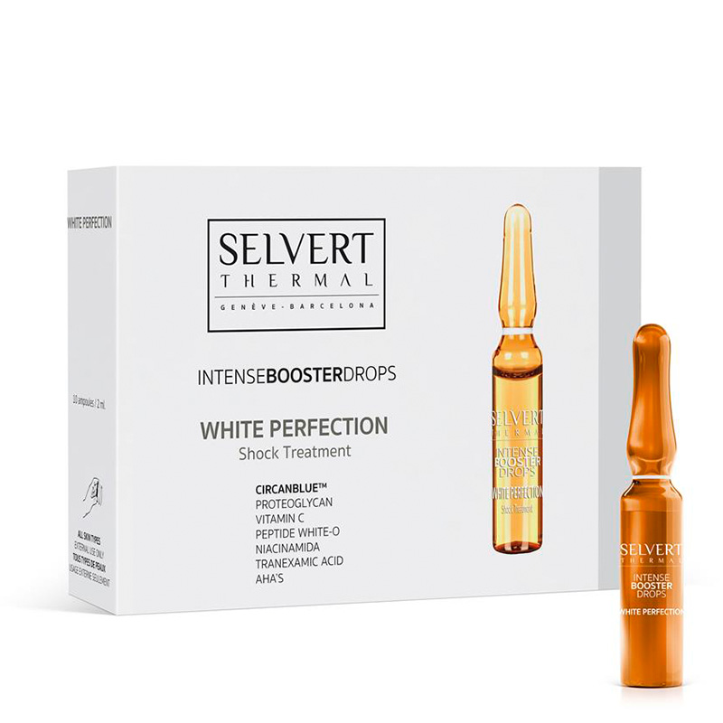 Głównym składnikim ampułek Intense Booster Drops White Perfection jest Circanblue™, który jako postbiotyczny składnik neutralizuje skutki światła niebieskiego, takie jak: negatywny wpływ na witalność komórek skóry, syntezę ATP oraz wzrost produkcji wolnych rodników i uszkodzeń DNA. Za działanie depigmentacyjne i wyrównujące koloryt skóry odpowiada kwas traneksamowy oraz niacynamid. W ampułkach znajdują się również proteoglikany i witamina C.