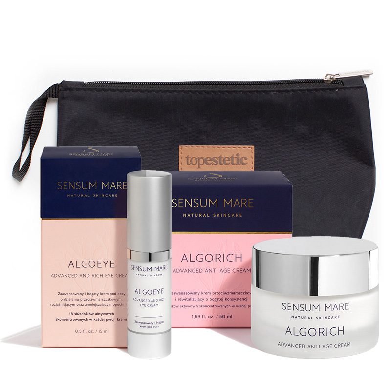 AlgoEye & Algorich Cream - komplet kosmetyków o bogatej konsystencji przeznaczonych szczególnie dla osób o cerze suchej i dojrzałej. Formuły tych preparatów obfitują w składniki aktywne działające nawilżająco, przeciwzmarszczkowo i wygładzająco na skórę twarzy i okolic oczu. Do kosmetyków dołączona jest również czarna, praktyczna kosmetyczka z logo Topestetic.