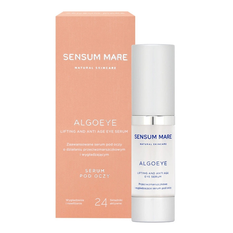 Zaawansowane serum pod oczy o działaniu przeciwzmarszczkowym i wygładzającym marki Sensum Mare posiada bardzo bogaty, różnorodny skład. Zawiera osiem alg morskich, liczne ekstrakty oraz oleje roślinne. W kosmetyku obecny jest także specjalny peptyd, który zapobiega pogłębianiu się mimicznych zmarszczek i zwiększa ujędrnienie skóry. Produkt przyniesie również bardzo dobre rezultaty w przypadku zniwelowania cieni i obrzęków pod oczami, a to za sprawą działania kofeiny.