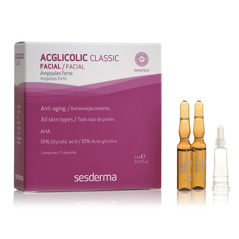 Acglicolic Classic Ampułki o silnym działaniu przeciwstarzeniowym. Ampułki z 10% kwasem glikolowym wykazujące intensywne działanie przeciwzmarszczkowe i liftingujące. Produkt złuszcza martwe komórki naskórka pozostawiając skórę promienną i odnowioną. Ampułki normalizują wydzielanie sebum, wspomagają syntezę kolagenu oraz wygładzają strukturę naskórka sprawiając, że zmarszczki, pory i linie na twarzy są mniej widoczne. Zawartość ekstraktów roślinnych wzmacnia działanie antyoksydacyjne produktu. Witamina E umieszczona dodatkowo w formule chroni przed negatywnym wpływem wolnych rodników przyspieszających starzenie się skóry. Ampułki posiadają zaawansowane działanie anti-aging oraz sprawiają, że po zastosowaniu skóra jest wygładzona, napięta i promienna. Produkt polecany dla osób przyzwyczajonych do działania kwasu glikolowego lub do stosowania między zabiegami z użyciem kwasów złuszczających w celu podtrzymania efektów.