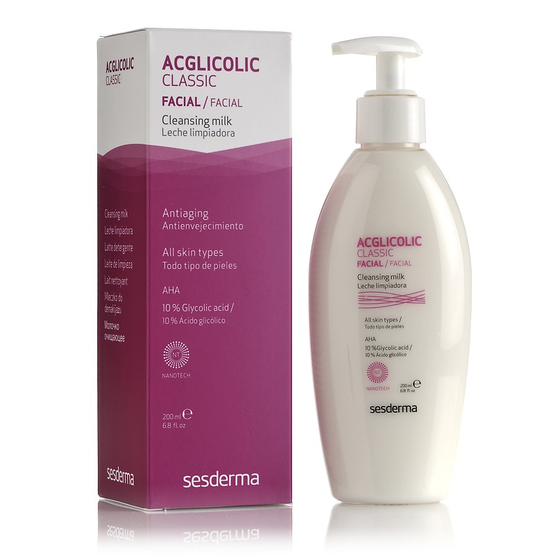 Acglicolic Classic Mleczko oczyszczające zastępujące wodę i mydło. Nie zawiera alkoholu ani olejków. Odpowiedni do oczyszczania i nawilżania zarówno cery normalnej, suchej jak i tłustej, szczególnie poddawanej kuracjom z użyciem kwasu glikolowego. Głęboko oczyszcza, ułatwia usuwanie zanieczyszczeń, zwęża pory, uspokaja, wygładza i nawilża skórę, bez natłuszczania jej. 10% kwas glikolowy przeciwdziała starzeniu skóry poprzez stymulację syntezy kolagenu, ujędrnia i wygładza zmarszczki mimiczne. Usuwa martwe komórki i wygładza powierzchnię skóry. Zawiera ceramidy, które tworzą film ochraniający strukturę naskórka, co zapewnia przedłużone działanie nawilżające. Zawarte kwasy boswoliowe działają łagodząco na skórę.