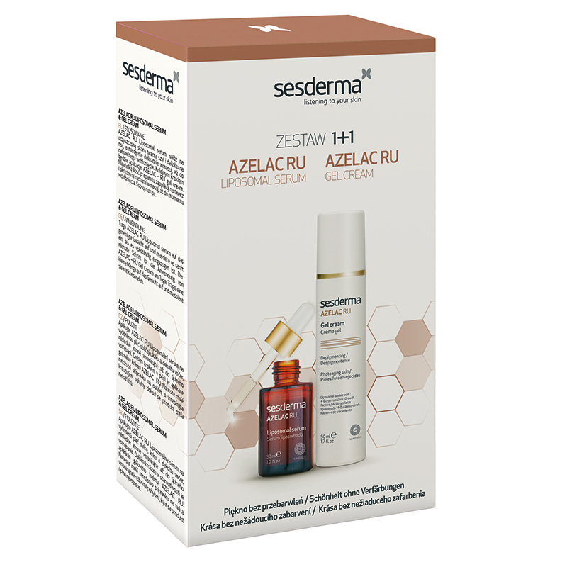 Zestaw Azelac RU jest przeznaczony do pielęgnacji skóry z przebarwieniami i nierównomiernym kolorytem. Opiera swoje działanie na skoncentrowanych formułach serum liposomowego i kremu-żelu depigmentującego. W wyniku regularnego stosowania produktów plamy pigmentacyjne zostają zniwelowane, a koloryt cery staje się bardziej jednolity.