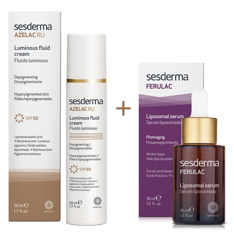 Zestaw składający się z emulsji rozświetlającej SPF50 oraz serum o działaniu antyoksydacyjnym. Zestaw sprawdzi się idealnie w przypadku skóry skłonnej do powstawania przebarwień, z oznakami fotostarzenia oraz dojrzałej. Poza zawartością filtrów przeciwsłonecznych SPF50, emulsja została wzbogacona o składniki depigmentujące takie jak kwas azelainowy, kwas traneksamowy, 4-butylrezorcynol, czynniki wzrostu, a także rozświetlające pigmenty nadające promienny wygląd. W składzie serum znajdziemy składniki o działaniu antyoksydacyjnym takie jak kwas ferulowy, floretyna, witamina C, a także retinol oraz olej jojoba.