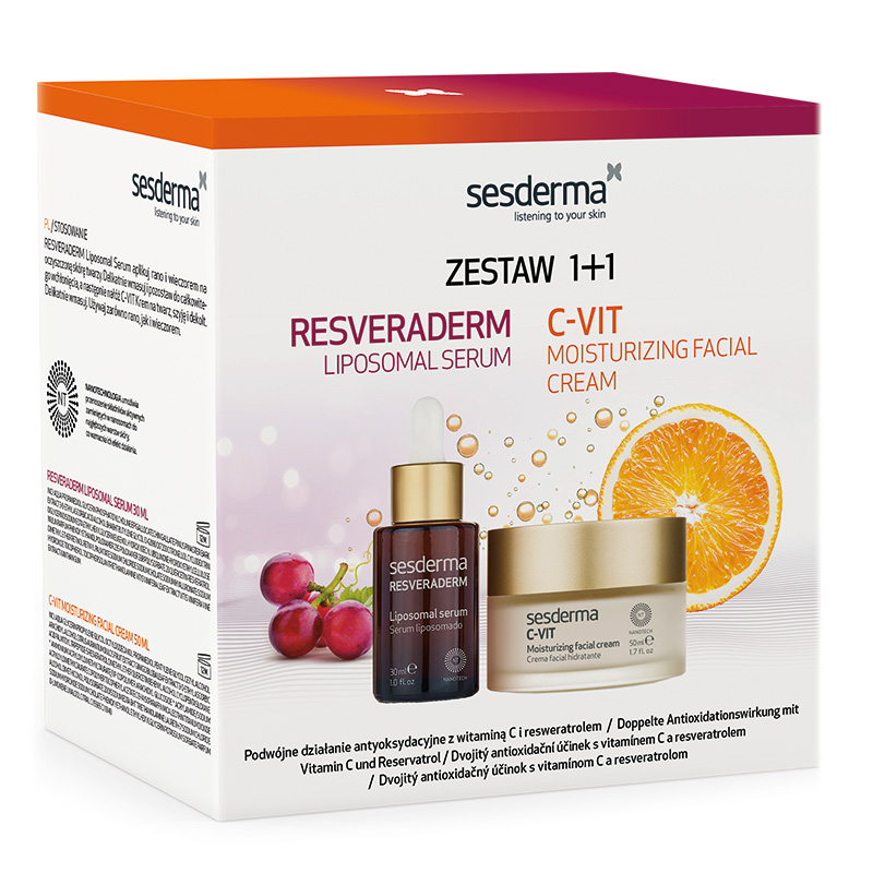 Zestaw Sesderma zawierający liposomowe serum i krem do twarzy o silnych właściwościach antyoksydacyjnych. Połączenie stabilnej formy witaminy C z serum i resweratrolu z kremu pomaga walczyć z fotostarzeniem i opóźnia pojawianie się na skórze oznak upływającego czasu. Dodatkową korzyścią ze stosowania zestawu jest poprawa kolorytu cery.