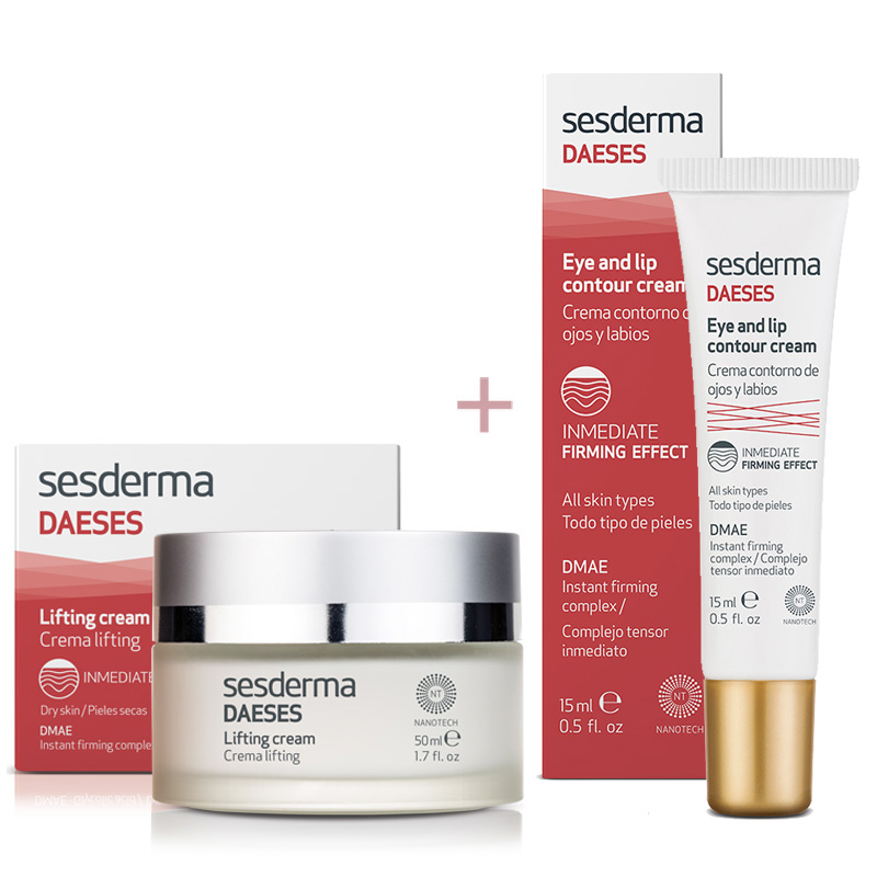 Daeses Lifting Cream + Eye and Lip Contour Cream ZESTAW. Zestaw dedykowany dla osób ze skórą dojrzałą wymagającą liftingu, odżywienia i regeneracji. Szczególnie polecany dla osób z widocznymi zmarszczkami i utratą jędrności. W skład zestawu wchodzi krem do twarzy oraz krem pod oczy, które wspólnie wpływają na poprawę wyglądu i kondycji skóry. Swoje działanie opierają na kwasie glikolowym oraz czynniku napinającym DMAE. W efekcie procesy starzenia są spowolnione, a cera staje się gładka i elastyczna.