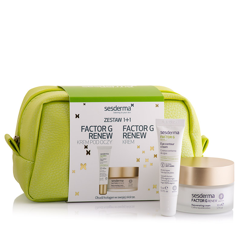 Zestaw zawierający krem do twarzy i krem pod oczy z linii Factor G w pojemnej zielonej kosmetyczce. Przeznaczony do pielęgnacji cery dojrzałej, suchej i wrażliwej. Wykorzystuje właściwości peptydów biomimetycznych, komórek macierzystych z jabłoni domowej oraz 7 czynników wzrostu pochodzenia roślinnego. W wyniku regularnego stosowania kosmetyki poprawiają jędrność, elastyczność i nawilżenie skóry.