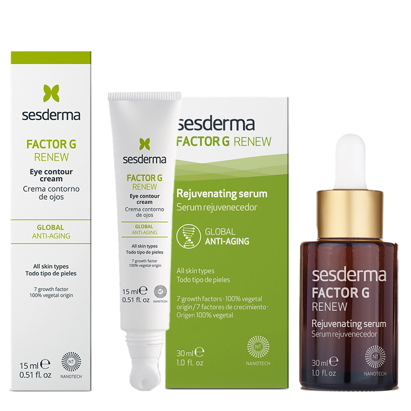 ZESTAW Factor G - Rejuvenating Serum + Eye Contour Cream. Specjalny zestaw dla tych, którzy opierają swoją pielęgnację przeciwstarzeniową na kosmetykach z linii Factor G Renew. Peptydy biomimetyczne, 5 czynników wzrostu pochodzenia roślinnego, wyciąg z wąkroty azjatyckiej to tylko niektóre ze składników aktywnych, które wpływają na jakość i skuteczność kremu pod oczy oraz serum do twarzy Factor G Renew. W preparatach tych użyto nanotechnologii, która gwarantuje zwiększenie absorpcji w głąb skóry.