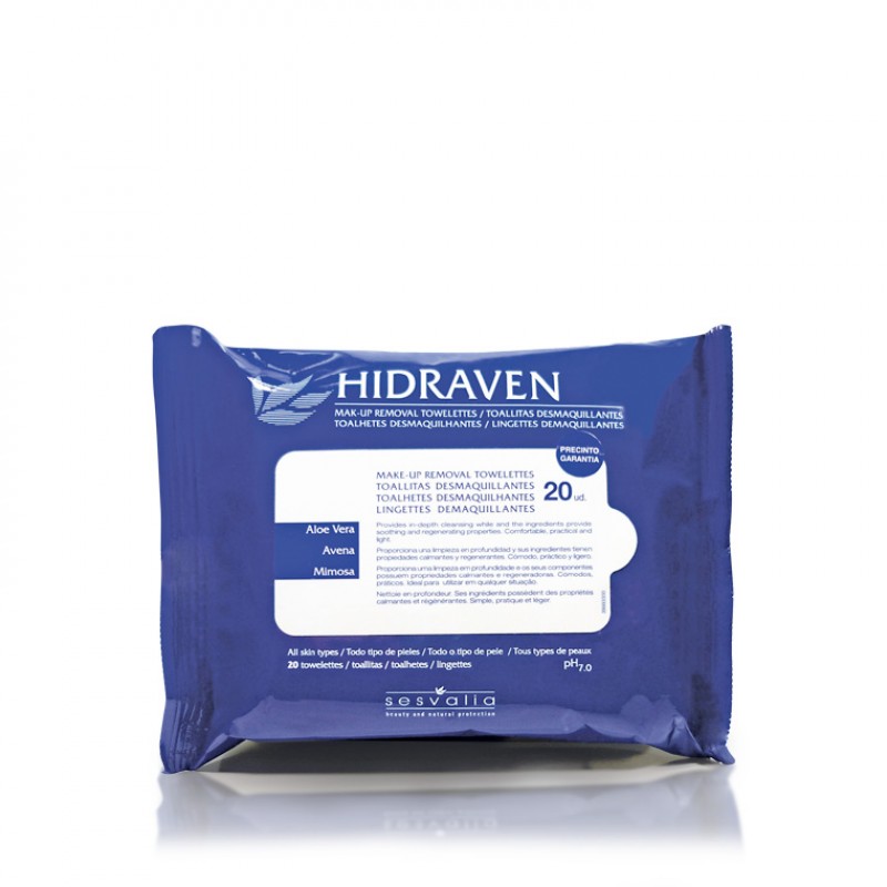 Hidraven - Chusteczki do demakijażu. Zapewniają dogłębne oczyszczanie skóry z wszelkich zanieczyszczeń i makijażu. Polecane są do każdego typu skóry. Wyjątkowo delikatne a zarazem wysoce skuteczne, nie wykazują działania drażniącego dzięki zawartości ekstraktu z owsa i rumianku zapewniającym załagodzenie wszelkich podrażnień. Przeznaczone do codziennego zastosowania.