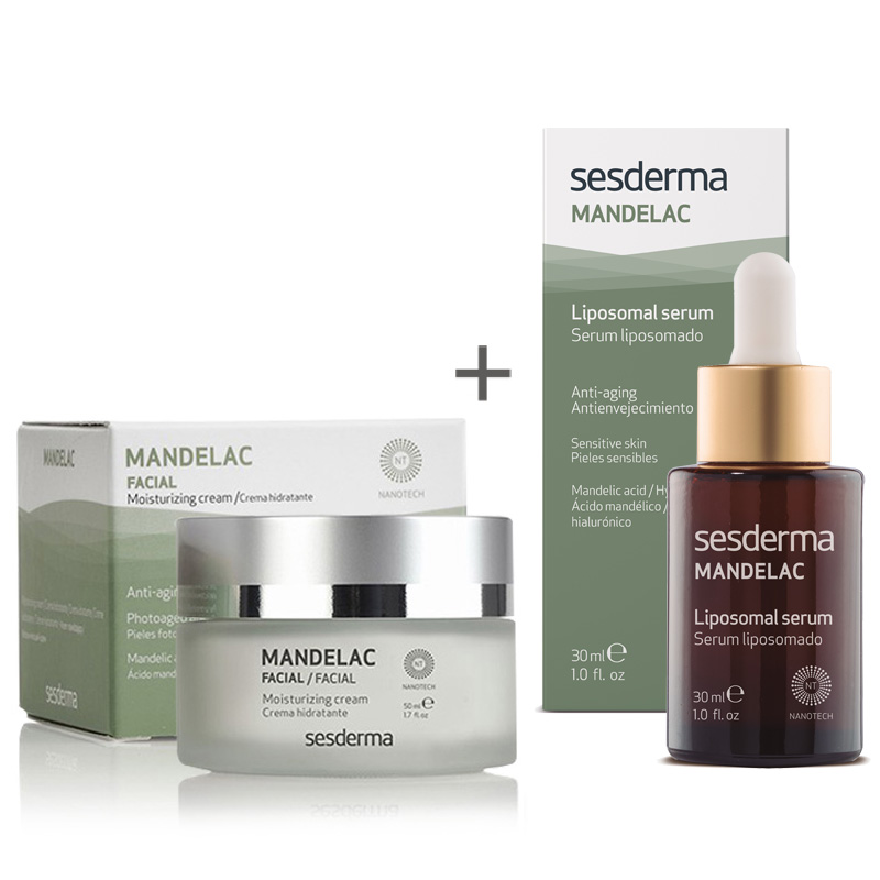 Mandelac ZESTAW. Zestaw złożony z kremu oraz serum, kosmetyków dedykowanych do pielęgnacji każdego typu skóry, a szczególnie cery mieszanej. Swoje działanie opiera na kwasie migdałowym, który wpływa na wygładzenie skóry, redukcje zmarszczek i zaskórników, a także wyrównanie kolorytu. Zestaw świetnie sprawdzi się zarówno w pielęgnacji porannej, jak i wieczornej. Świetnie sprawdzi się również jako uzupełnienie dla kuracji gabinetowych, a także jako przygotowanie dla kuracji złuszczających.
