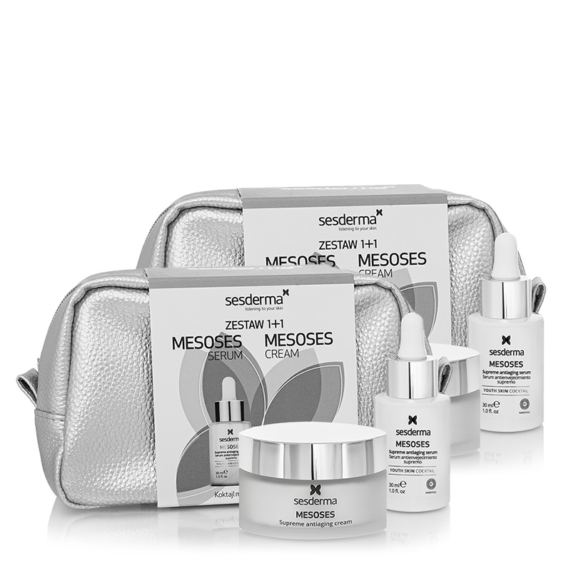 Na zestaw promocyjny Mesoses składa się serum liposomowe i krem do twarzy o otulającej, komfortowej konsystencji. Kosmetyki są przeznaczone do pielęgnacji skóry dojrzałej, wymagającej regeneracji, również po zabiegach gabinetowych. Dzięki zaawansowanym składnikom aktywnym pozwalają uzyskać rezultaty podobne do tych po zabiegu mezoterapii, a także podtrzymują efekty terapii gabinetowych.