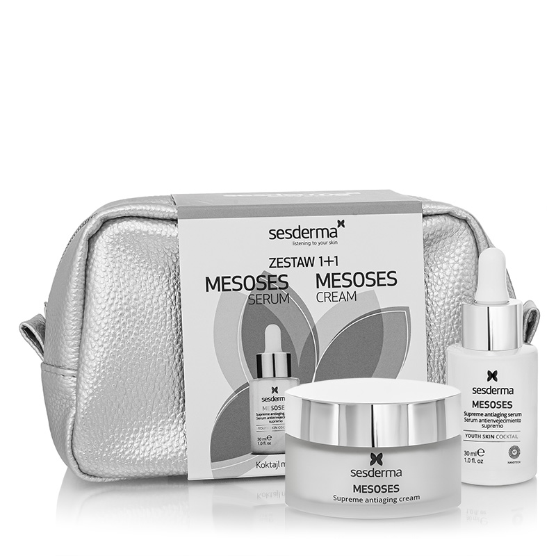 Na zestaw promocyjny Mesoses składa się serum liposomowe i krem do twarzy o otulającej, komfortowej konsystencji. Kosmetyki są przeznaczone do pielęgnacji skóry dojrzałej, wymagającej regeneracji, również po zabiegach gabinetowych. Dzięki zaawansowanym składnikom aktywnym pozwalają uzyskać rezultaty podobne do tych po zabiegu mezoterapii, a także podtrzymują efekty terapii gabinetowych.