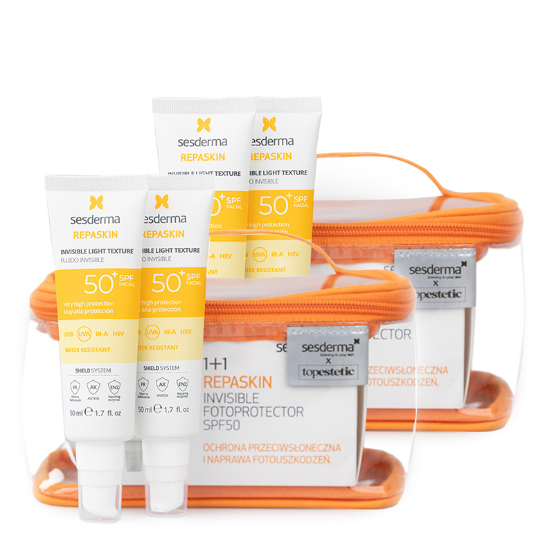 Zestaw Sesderma z fotoochronnej linii Repaskin w nowej odsłonie. Odpowiedni dla każdego rodzaju cery. Lekką emulsję Repaskin Fluido Invisible docenią szczególnie osoby ze skórą skłonną do przetłuszczania. Będzie odpowiednią bazą pod makijaż, także w czasie upalnych dni. Formuła zapewnia szerokie spektrum ochrony przed promieniowaniem UVA, UVB, IR oraz HEV. Do zestawu została dołączona wygodna, przezroczysta kosmetyczka, idealna na wakacyjne wyjazdy oraz na plażę.
