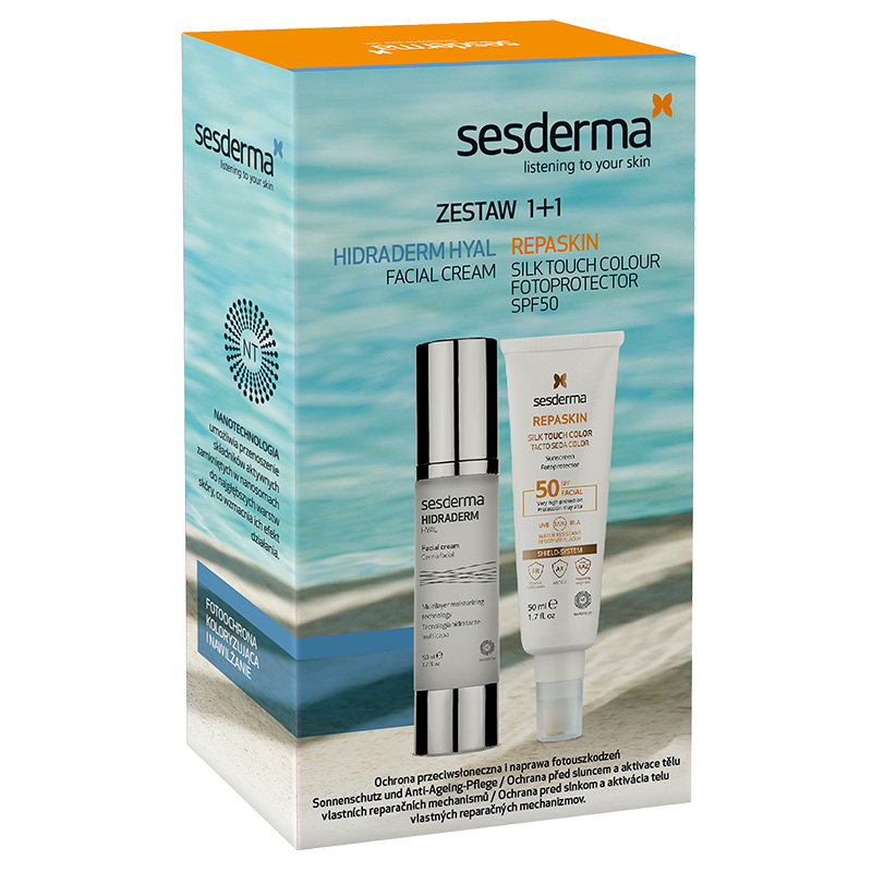Krem Hidraderm Hyal od Sesdermy znam i kocham od lat - to już mój ulubieniec. Nową perełką kosmetyczną (dla mnie) z tego zestawu okazał się Sesderma Repaskin Silk Touch Color SPF 50. Krem ma kolor bardzo ciemny, jednak po rozsmarowaniu okazuje się, że jest idealny. Skóra po aplikacji jest taka satynowa w dotyku - dla mnie "miodzio"! Specyfik przyjemnie pachnie. Jestem bardzo zadowolona z tego zakupu. Polecam! Genialny zestaw! Doskonały duet!