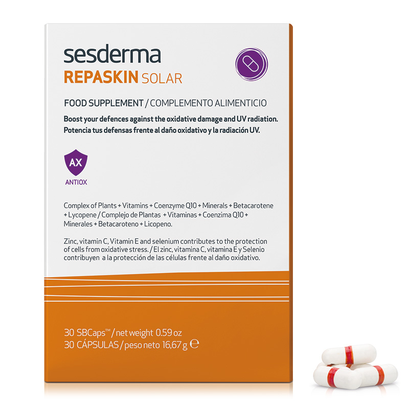 Repaskin Solar - Suplement diety. Zawiera bogactwo antyoksydantów jak cynk, witamina C, witana E, selen, które chronią komórki skóry przed stresem oksydacyjnym, który powstaje pod wpływem promieniowania słonecznego. Działanie to potęgują ekstrakty roślinne, beta-karoten, Koenzym Q10 i likopen. Idealne połączenie z fotoprotekcją, dzięki czemu obrona skóry przed uszkodzeniami i fotostarzeniem jest wzmocniona. Wystarczy tylko jedna kapsułka dziennie!