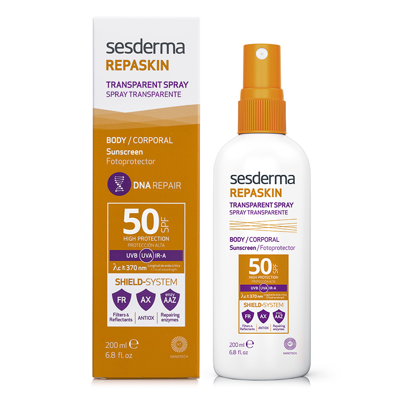 Repaskin Transparent Spray - Wysoka ochrona przeciwsłoneczna do ciała SPF 50 Innowacyjny preparat przeciwsłoneczny w formie transparentnego sprayu. W składzie znajdują się filtry przeciwsłoneczne fizyczne i chemiczne, które są niezwykle stabilne i zapewniają pełną ochronę przeciwsłoneczną zarówno dla promieniowania UVA jak i UVB oraz IR. Bardzo wysoka ochrona SPF 50 zapewnia odpowiednie zabezpieczenie przed poparzeniem słonecznym bez białego filmu na skórze. Kosmetyk idealny już od pierwszych dni zażywania kąpieli słonecznych. Zawarte w spray enzymy naprawcze, aktywowane pod wpływem promieni słonecznych, fotoliza i endonukleaza chronią i reperują DNA chroniąc skórę przed fotostarzeniem. Dzięki wykorzystaniu nowoczesnej technologii składniki aktywne wnikają w głębsze warstwy skóry wykazując pozytywne działanie. Rezultatem jest doskonale chroniona skóra oraz wspaniała wygoda stosowania.