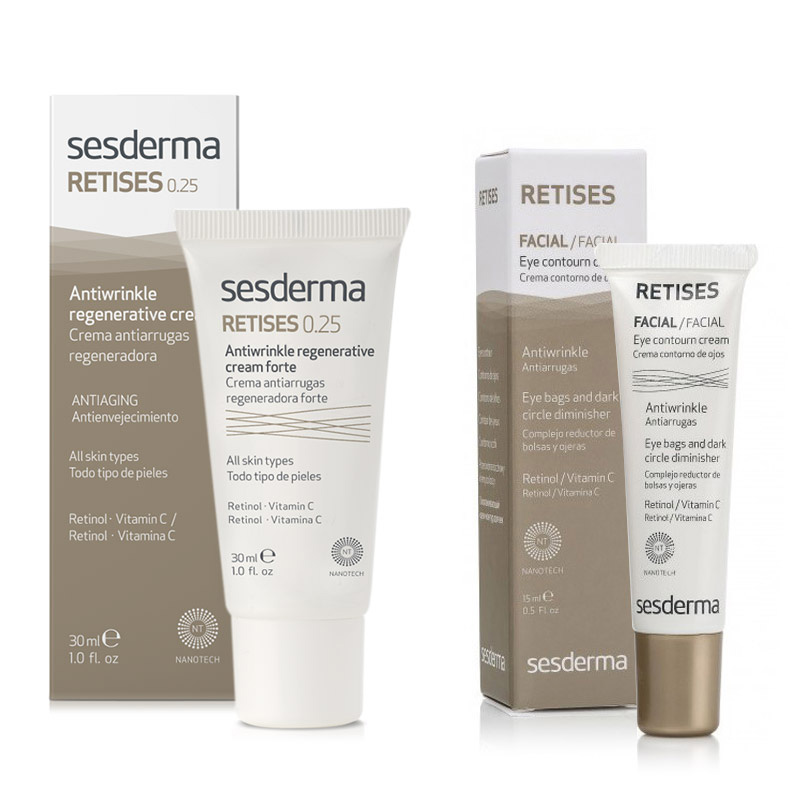 Retises 0,25% + 0,05% - ZESTAW Regenerujący krem przeciwzmarszczkowy+Przeciwzmarszczkowy krem pod oczy. Intensywna kuracja retinolowa dla skóry twarzy i skóry okolic oczu. Rozjaśnia przebarwienia, przyspiesza złuszczanie się skóry, jednocześnie ją wygładzając. Zwiększa syntezę kwasu hialuronowego oraz włókien kolagenowych i poprawia tym samym napięcie skóry. Doskonała profilaktyka przeciwstarzeniowe, jak i zmniejszająca widoczne już oznaki starzenia się skóry.