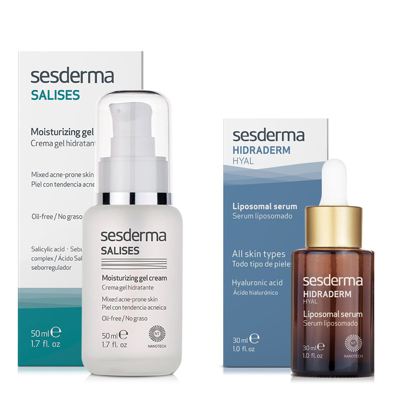 Salises + Hidraderm Hyal Liposomal Serum - ZESTAW Krem-żel nawilżający + Serum. Dobre połączenie pielęgnacyjne dla skóry z niedoskonałościami, która ma tendencję do przetłuszczania się, a będącej jednocześnie odwodnionej. Krem-żel Salises normalizuje pracę gruczołów łojowych i niweluje zmiany trądzikowe, a serum Hidraderm Hyal zadba o utrzymanie optymalnego nawilżenia w skórze. W bardzo efektywny sposób działa na skórę.