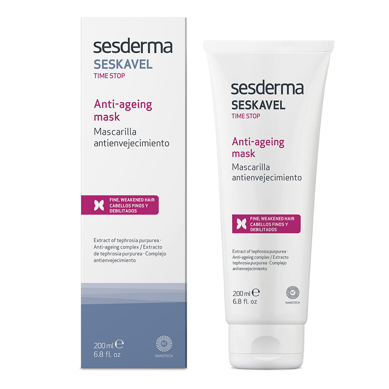 Seskavel Anti-Ageing Mask - Przeciwstarzeniowa maska do włosów. Intensywna maska przeznaczona dla włosów suchych, szorstkich, łamliwych, z rozdwojonymi końcówkami. Wykazuje właściwości silnie regenerujące, nawilżające oraz ochronne. Ekstrakt z jedwabiu pielęgnuje strukturę włosa oraz chroni przed rozdwojonymi końcówkami. Olej jojoba intensywnie odżywia włosy, a kofeina pobudza krążenie, dzięki czemu cebulka włosa zyskuje lepsze ukrwienie. Maska pozostawia włosy gładkie, miękkie i jedwabiste.