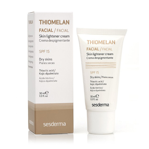 Thiomelan - Krem depigmentujący SPF15. Kuracja niwelująca przebarwienia spowodowane ciążą, stosowaniem kosmetyków czy leków. Szczególnie zalecany w przypadku piegów czy plam posłonecznych. Idealnie skomponowany zestaw kwasów alfa-lipoinowego 3%, dipalmitynianu kojowego 2% oraz kwasu fitowego 1%, działa niezwykle skutecznie na skórę, a z tokoferolem( postacią witaminy E ) posiada działanie silnie przeciwutleniające oraz neutralizujące wolne rodniki. Dzięki dipalmitynianowi kojowemu przebarwienia się zmniejszają, wzmagając proces syntezy melaniny. W efekcie stosowania skóra odzyskuje równomierny koloryt.