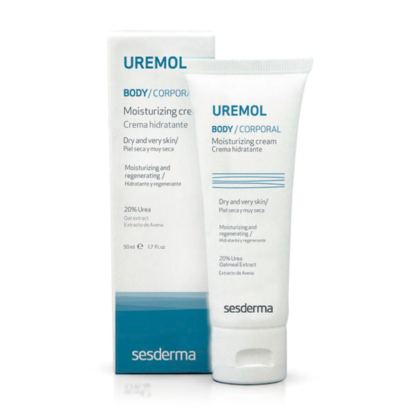 Uremol - Krem nawilżający. Krem o silnym działaniu nawilżającym, przeznaczony do bardzo suchej skóry oraz skóry z problemami hipertrofii. W składzie obecny 20% mocznik przyczynia się do natychmiastowego wzrostu poziomu nawilżenia oraz reguluję warstwę rogową naskórka. Produkt posiada również działanie łagodzące oraz keratolityczne. Dodatek 1% wyciągu z owsa nadaję produktowi właściwości przeciwświądowe i regenerujące oraz oczyszcza skórę. Idealnie sprawdzi się w przypadku obszarów narażonych na ekstremalne wysuszenie: łokci, kolan, rąk, stóp.